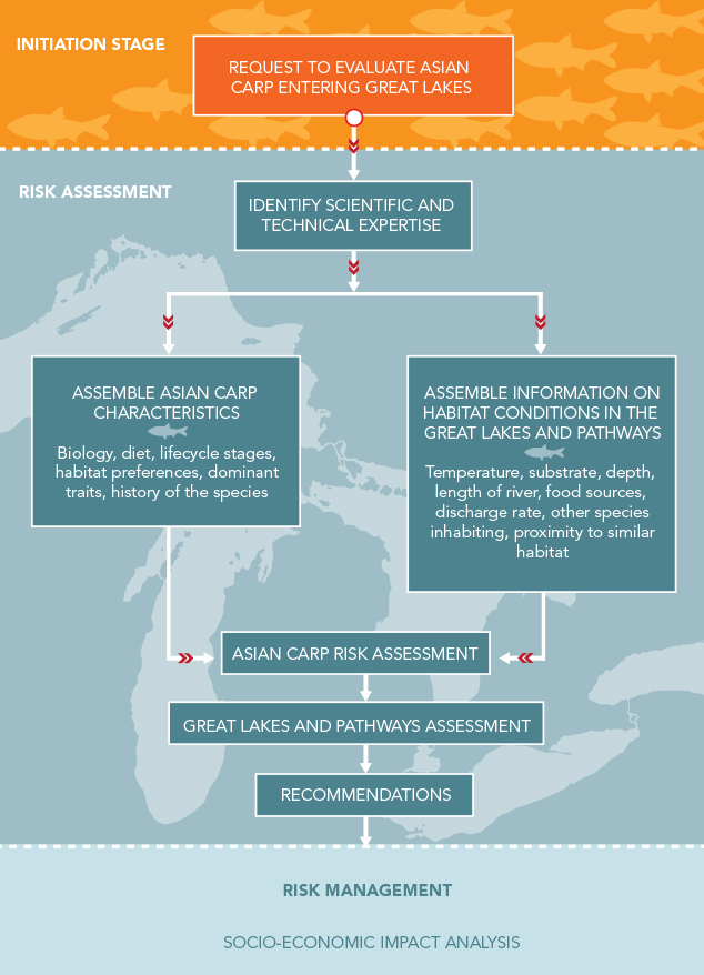 When dealing with the likelihood of an Aquatic Invasive Species (AIS) introduction, the assessment estimates the probabilities of arrival, survival, establishment, and spread. One of the main components of the risk assessment is to determine the magnitude of the ecological impacts that would result from the invading species entering a particular pathway, or in this case, invasive carps entering the Great Lakes. In order for an assessment to be accurate, it uses both qualitative (descriptions) and quantitative (numbers) information in an organized way to rank the likelihood and magnitude of risk. It is also important for the assessment to provide risk managers with recommendations and mitigation measures to reduce the risk.