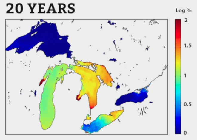 If bigheaded carps were to enter Lake Michigan through the United States, it would take less than 5 years to reach the Canadian waters of Lake Huron. Afterward it would take less than 10 years for them to spread from Lake Michigan to Lake Huron to Lake Erie. Within 20 years it is predicted that there would be large populations in lakes Michigan, Huron, and Erie.
