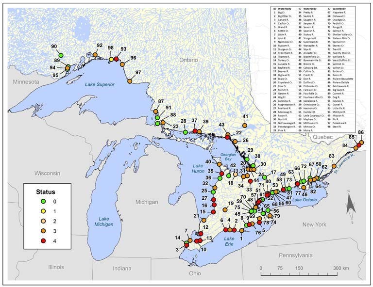 - Suitable spawning conditions exist in up to 57 rivers in the Great Lakes basin.