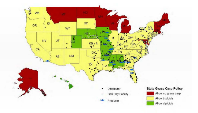 Three vectors of potential entry into the Great Lakes basin were identified and assessed: physical connections, human-mediated release, and laker ballast. For Lake Erie, it is still unclear if the arrival of diploid Grass Carp occurred through the vectors and pathways considered in arrival, or if it occurred through spread from another Great Lake. Possession, importation, propagation, stocking, sale and transportation of Grass Carp, diploid or triploid, is prohibited in Michigan, Minnesota, Ontario, or Wisconsin. Only triploid Grass Carp are allowed in Illinois, Indiana, Ohio, New York, and Pennsylvania. Possession of diploid Grass Carp are permitted in Iowa and Missouri, which each border at least one Great Lakes state (see Figure 1). Regulations and their effective enforcement are important factors that may affect the likelihood of arrival.