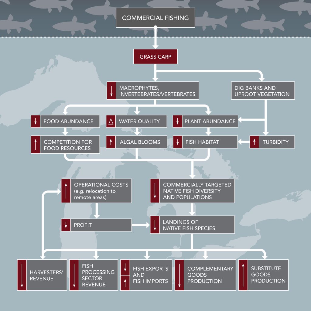 To assess the impacts of Grass Carp on commercial fishing, this study examined the ecological consequences on the native species which are fished commercially in the Great Lakes. The present estimated value of the commercial fishing industry is approximately $230 million (USD) per year in Canada and approximately $145 million (USD) per year in the U.S. The presence of Grass Carp would increase costs and decrease revenues for commercial harvesters and would have multiple impacts to commercial fishing, including: