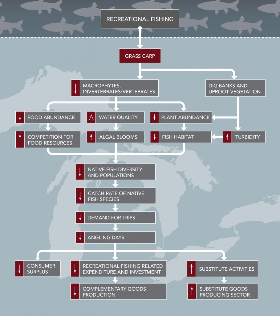 The impacts on recreational fishing were determined by examining how anglers would be impacted. More specifically, the study looked at how the presence of Grass Carp would cause a reduction in the number of days anglers are out angling. The value of recreational angling is estimated to be worth approximately $556 million (USD) per year in Canada and $3 billion (USD) per year in the U.S. Grass Carp presence could have many impacts to recreational fishing, including:
