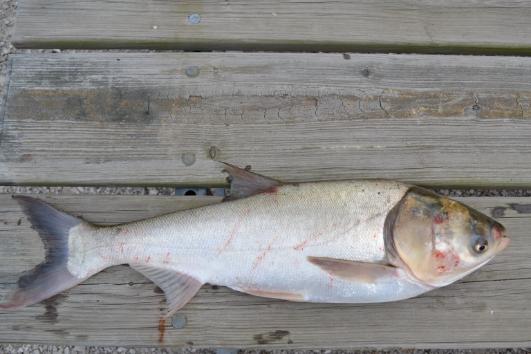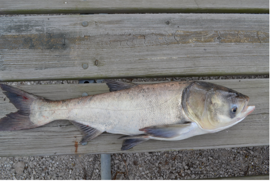 Silver Carp are deep-bodied, or wide, with a moderately large and broad head encompassing just under one third of their body size. They have a toothless upturned lower jaw and eyes are located below the axis of the body. Their body is silver with a slate gray head and dorsal surface and white belly with a keel extending from the anal fin to the throat. They are closely related to Bighead Carp and have been known to hybridize (cross-breed) with that species and produce viable, reproductive offspring.