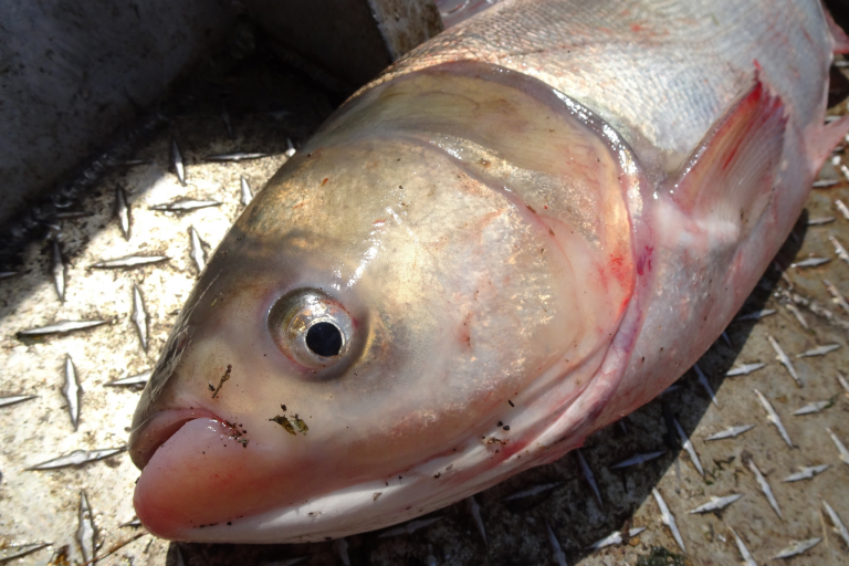 Silver Carp can jump 9 feet or more out of the water when startled by boat engines. This poses a hazard for anglers, boaters and other recreational users. This high flying, jumping invader are a schooling species and can be found in large numbers.