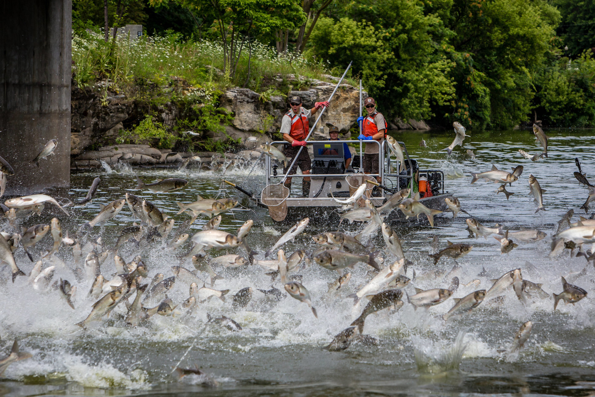 Also called “flying carp” because they can jump three or more meters (eight to nine feet) out of the water when frightened by boat engines.