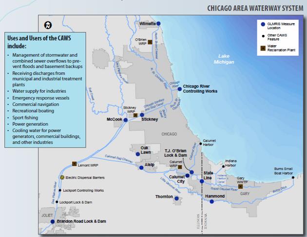 The Chicago Waterway System (CAWS), a series of canals and rivers in and near Chicago, artificially connects the Great Lakes to the Mississippi River basins. The waterway serves as a vibrant transportation corridor, a route for pleasure boats, and a water management system. The high importance and reliance of the waterway requires all studies to take into account the transportation, economic, and water management implications of introducing a new technology or barrier system.